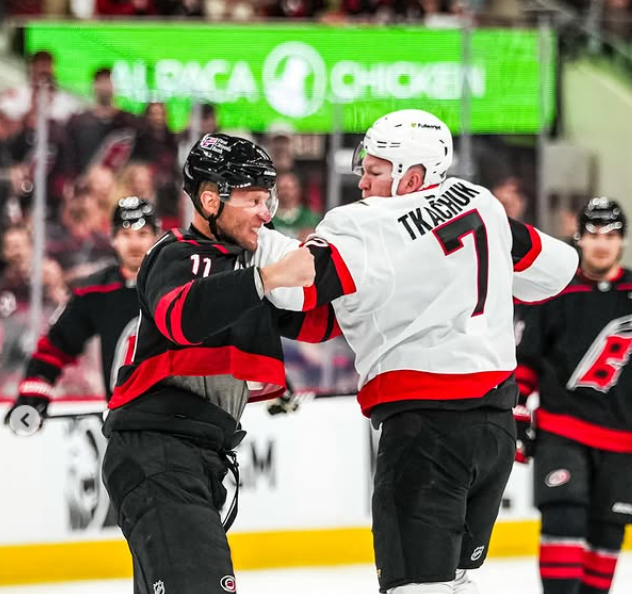 The Carolina Hurricanes and Ottawa Senators dropped the puck… and instantly dropped the gloves. Captains Brady Tkachuk and Jordan Staal went at it seconds into Game 1, turning the opening faceoff into a full-on fight.